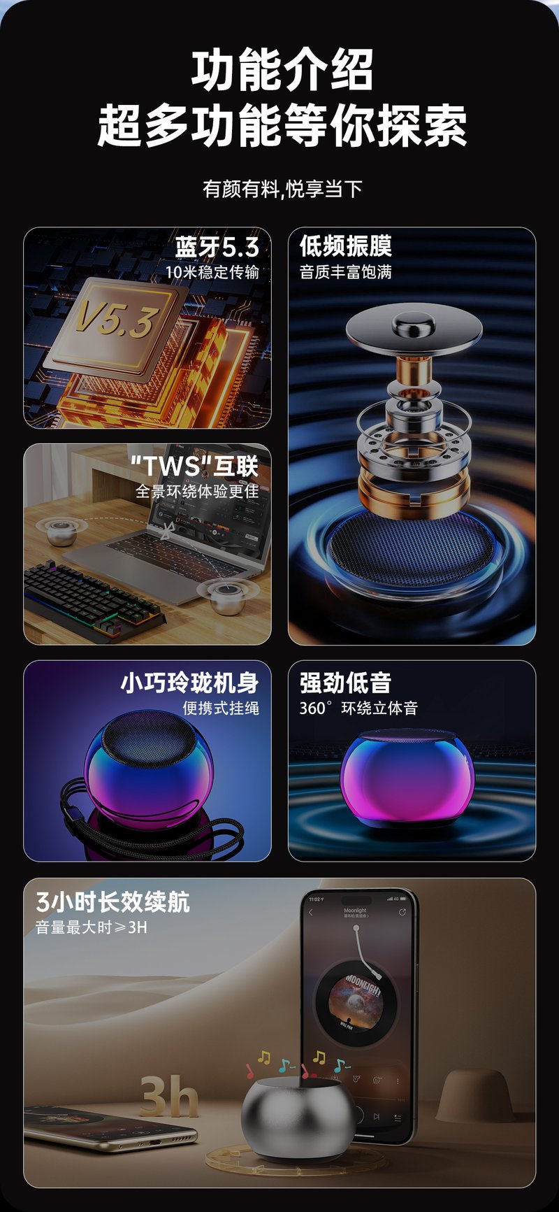 15分鐘前炫彩無線藍牙音箱,戶外便攜,小音響大音量,多重音效, 360°全向音效 - 2入組 買一送一! NT$999